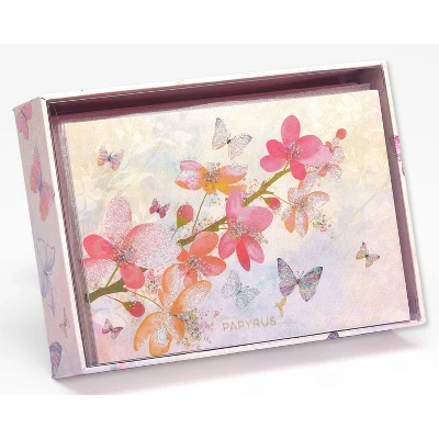 Gorgeous flowers and butterflies in femme hues with glittery accents offer elegance to these Papyrus note cards. Cards are left blank inside for your own message. Set of 12 cards comes with coordinating envelopes, gold Papyrus hummingbird seals and a patterned box with acetate lid.