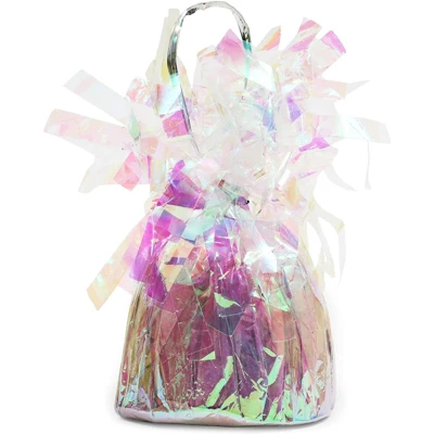 - BALLOON WEIGHTS: Each balloon weight is wrapped in a decorative, metallic holographic material with tinsel-like colorful fringes on the top