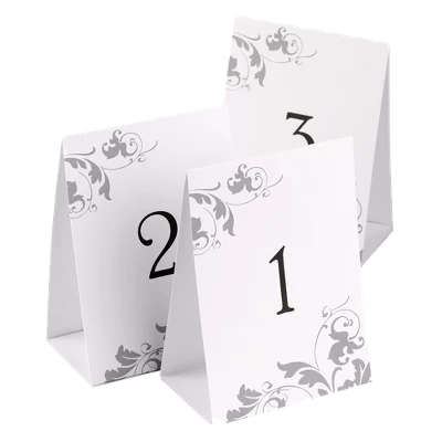 Organize your wedding reception or other formal event with these table number tents from Hortense B. Hewitt. Made from heavy white paper with a gray floral design, these tents help your guests find their assigned tables. This set displays the numbers 1 through 40 in black ink.