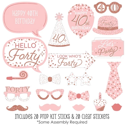20-Piece Girl Birthday Party Photo Booth Props Kit INCLUDES 20 40th Pink Rose Gold Birthday photo booth props, 20 sticks and stickers for assembly. EASY ASSEMBLY: Simply attach the printed DIY photo booth props to the sticks with included reinforcing stickers. PERFECT FOR ANY CROWD! Photo booth props are fun party supplies for adults and kids – everyone will love these 40th Pink Rose Gold Birthday photo booth props. Take entertaining and shareable party photos of your friends and family while making memories with these fun photo booth props! PRETTY PINK AND ROSE GOLD PARTY DECORATIONS: There are many fun ways to use these cute photo booth props! Use as intended at home, school or work and take party photos to share; add them to vases and floral arrangements as a fun Girl Birthday Party centerpiece; or accent yourHello Forty Birthday Girl candy buffet by displaying them in apothecary candy jars! HIGH-QUALITY PARTY SUPPLIES: 40th Pink Rose Gold Birthday photo booth props are professionally printed on thick cardstock paper. They will arrive cut out and ready to assemble with the included sticks and stickers. MADE IN THE USA: 40th Pink Rose Gold Birthday – Girl Birthday Party Photo Booth Props Kit is designed and manufactured at our Wisconsin facility using materials that are Made in America. 40th Pink Rose Gold Birthday photo booth props use a No-Mess Glitter Print: Our photo booth props are designed with a printed image of glitter, eliminating glitter flake while maximizing bling effect!