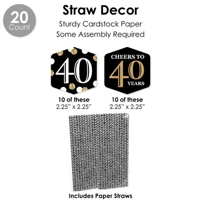 DIY WRAPPERS includes: 20 total reversible wrappers that are 10.75″ wide x 2″ tall. When wrapped, they can accommodate favors 1.75″ to 2.5″ in diameter. These wrappers for a Fortieth Birthday Party are easy to secure on a variety of items! CUPCAKE WRAPPERS includes: 20 adjustable cupcake wrappers 1.75″ – 2.5″ wide x 1.75″ tall. Adult 40th Birthday – Gold cupcake wrappers will fit over cupcake liners on standard and medium-sized cupcakes and are reversible for a coordinated look. Secure cupcake wrappers by sliding the tab into appropriate slit. TREAT PICKS includes: 20 cut-outs 2″ wide x 2.25″ tall & clear treat picks 4″ tall. Gold 40th Themed paper cut-outs come in 2 designs. Assembly stickers are included for easy DIY required assembly. FAVOR GIFT TAGS includes: 20 gift tags 3.5″ wide by 2.75″ tall & satin ribbon. Write a special message on the back side of Adult 40th Birthday – Gold gift tags for a personal touch then attach to favors with ribbon. STRAW DECOR includes 20 cut-outs with 2 designs10 of each, size 2.25″ wide by 2.25″ tall and chevron striped paper straws – 7.75″ tall. Shaped cut-outs are professionally printed on sturdy cardstock paper. For easy assembly, create your stylish drinks by attaching Gold 40th Themed shaped cut-outs to paper straws with clear stickers included. Favor party pack is designed and manufactured at our Wisconsin facility using materials that are Made in the USA. Adult 40th Birthday – Gold favor pack uses a No-Mess Glitter Print: Our party kits are designed with a printed image of glitter, eliminating glitter flake while maximizing bling effect!