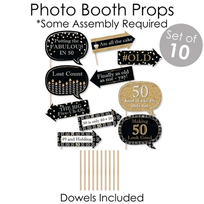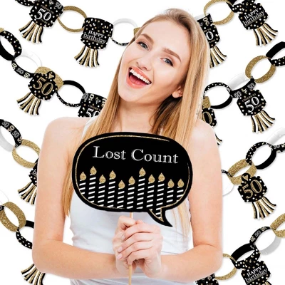 Doterrific Bundle INCLUDES: Bunting Banner “Happy Birthday”, Paper Chains Garland 21 Feet, and Funny Photo Booth Props Kit 10-Piece. Style any birthday party with coordinating Adult 50th Birthday – Gold-themed party supplies. Use Adult 50th Birthday – Gold Doterrific Bundle to create an impressive photo booth backdrop. Please Note: Assembly is Required. BUNTING BANNER: Greet your party guests with a Adult 50th Birthday – Gold bunting banner. Assemble the themed pennant flags with included ribbon and hang with the included wall mount adhesives. Each pennant measures 5.5″ wide x 8.5″ high. Satin ribbon measures 24 feet long and 3/8″ wide. Hang at the entrance of your event, at the gift table, or display as a background for photo ops. PAPER CHAINS: Adult 50th Birthday – Gold paper chains decoration kit will arrive flat and is easy enough for the whole family to assemble. The heavy-duty paper tassels give our paper chains a unique flair. Dress up all areas of your 50th birthday party with paper chains. For decorating fun, wrap paper chains down a staircase railing or use as a photo backdrop. PHOTO PROPS: 10-Piece Funny Adult 50th Birthday – Gold photo booth props include 4 speech bubble shapes (10.25″ wide x 8.25″ tall), 6 arrow shapes (10.5″ wide x 4.5″ tall), 10 dowel sticks (12″ tall). For easy assembly, adhesive dots and stickers are included. Use photo props and dowels as centerpieces or scatter props throughout your event space for even more party fun. MADE IN THE USA: Adult 50th Birthday – Gold Doterrific Bundle is designed and manufactured at our Wisconsin facility using materials that are Made in the USA. Professionally printed on sturdy cardstock paper with a photo-like shine. Our Doterrific Bundle Kit use a No-Mess Glitter Print: Our DIY party decorations are designed with a printed image of glitter, eliminating glitter flake while maximizing bling effect!