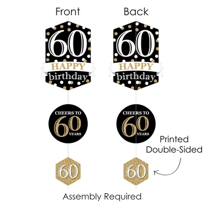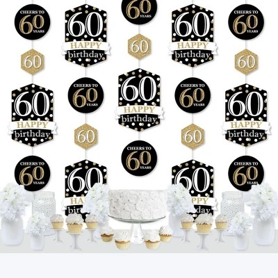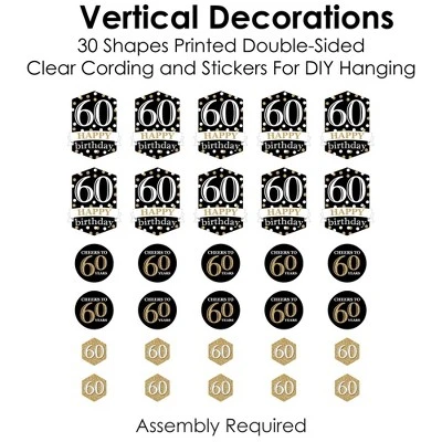 Adult 60th Birthday – Gold Hanging Vertical Decorations INCLUDE 30 shaped pieces, 1 roll clear cording, and assembly stickers. Adult 60th Birthday – Gold Vertical Decorations are fun and versatile party danglers for your next Birthday Party. ROOMERIFIC: Adult 60th Birthday – Gold Hanging Vertical Decorations can be displayed at any lengths you choose and make an attractive backdrop for your next Birthday Party. Shaped pieces come in 3 sizes of 10 each, with the following specifications: 10 at 8.5 x 11 inches, 10 at 6.25 x 6.25 inches, and 10 at 4 x 4.5 inches. Hang near a wall to capture fun group photos, or place throughout the room to create a unified theme. These also look amazing when coordinated above gift and buffet tables. DIY DONE RIGHT: Get ready for guests in a snap with this colorful, easy-to-assemble, 30-piece Adult 60th Birthday – Gold Hanging Party Decorations kit. Printed double-sided, each shaped piece includes top and bottom tabs for easy hanging. Simply interlock clear cording into each piece and secure with provided clear stickers. HIGH-QUALITY DECOR: Adult 60th Birthday – Gold Hanging Vertical Decorations are professionally printed on heavy-duty cardstock paper. Each piece is individually inspected and carefully packaged by hand. Requires some simple do-it-yourself assembly. Use provided clear cording to display decorations however you prefer. MADE IN THE USA: Adult 60th Birthday – Gold Hanging Vertical Decorations are designed and manufactured at our Wisconsin facility using materials that are Made in the USA. Adult 60th Birthday – Gold Hanging Vertical Decorations use a No-Mess Glitter Print: Our Vertical Decorations are designed with a printed image of glitter, eliminating glitter flake while maximizing bling effect!