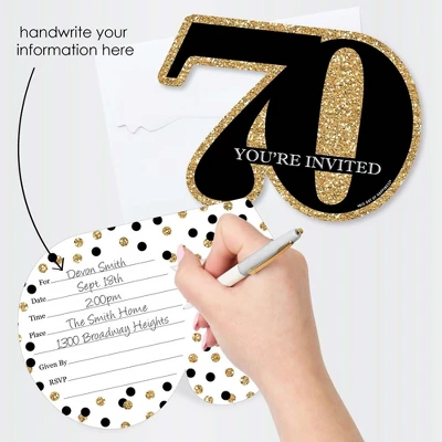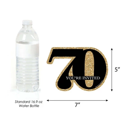 Adult 70th Birthday – Gold Fill-In the Blank Invitation Set INCLUDES 12 seventieth party invitations and 12 premium white envelopes. Adult 70th Birthday – Gold fill-in invitations are perfect for any event. The black and gold theme are great for a birthday party. Adult 70th Birthday – Gold party invitations SIZE 7 inches by 5 inches. The included envelopes measure 5 inches by 7 inches. The back of each Adult 70th Birthday – Gold party invitation has space to add your party details: For: Date: Time: Place: Given By: RSVP: PREMIUM PARTY INVITATIONS: 70th party invitations are professionally printed on heavy-duty card stock paper with a photo-like shine. They are individually inspected, then carefully packaged with our exclusive squiggle flap envelopes, making this Adult 70th Birthday – Gold stationary set a must-have for any birthday party. MADE IN THE USA: Adult 70th Birthday – Gold – Birthday Party Shaped Invitations are designed and manufactured at our Wisconsin facility using materials that are Made in the USA. Adult 70th Birthday Fill-In Invitations use a No-Mess Glitter Print: Our invitations are designed with a printed image of glitter, eliminating glitter flake while maximizing bling effect!