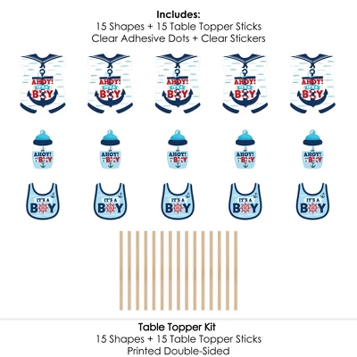 Ahoy It’s a Boy Centerpiece Sticks INCLUDES 15 nautical table toppers in three different shapes, 15 sticks and stickers for easy assembly. Boat party table decorations are perfect for a baby shower. Ahoy It’s a Boy Party Centerpiece Sticks SIZE five bodysuit table toppers, 8.25″ wide x 10.75″ tall; five bib table toppers, 6″ wide x 6.75″ tall; and five bottle table toppers, 3.75″ wide x 7″ tall. The unique design and variety of pieces makes this table decoration kit an impressive addition to any nautical theme party. EASY PARTY DECOR: Ahoy It’s a Boy table decorations can be used as centerpieces when attached to the included sticks and inserted into vases or floral arrangements. They easily accent your baby shower candy buffet when you add them to apothecary jars. Table toppers are also a great addition to any photo booth. The large shaped cut outs will make your party pics instantly shareable. Ahoy It’s a Boy centerpiece sticks are sure to make a statement however you choose to use them! PREMIUM PARTY SUPPLIES: Ahoy It’s a Boy party table toppers are professionally printed on heavy-duty cardstock paper with a photo-like shine. They are individually inspected and carefully packaged by hand with sticks and stickers for easy assembly. Get creative with your DIY party ideas! MADE IN THE USA: Ahoy It’s a Boy – Baby Shower Centerpiece Sticks are designed and manufactured at our Wisconsin facility using materials that are Made in America.