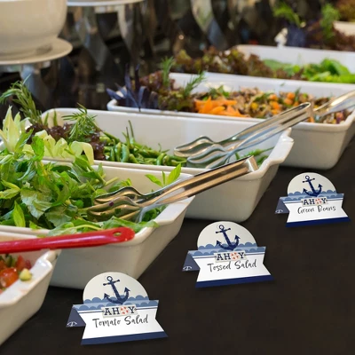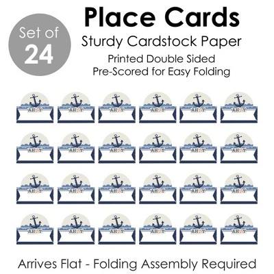 Ahoy – Nautical Place Cards INCLUDES 24 individual cards that measure 3.5β wide x 2.5β tall when assembled. Easy to use, these tabletop accents are perfect to use at your next Birthday Party or Baby Shower. VERSATILE IN USE: Whether itβs a small party or large gathering, the Blue Anchor Place Cards can be used in a variety of ways. Handwrite words in the blank space and then set them on the buffet table, as part of a place setting, or consider using them for an icebreaker activity. EYE-CATCHING DESIGN: Featuring crisp graphics with an innovative cut design, Ahoy – Nautical Place Cards will easily draw in attention without taking up too much space. To assemble, push back the top outer edge, revealing the half-circle top. Fold along the pre-scored line in the center to create the tent shape, and then display! HIGH-QUALITY: Blue Anchor Place Cards are professionally printed double-sided on sturdy cardstock paper with a photo-like shine. They are individually inspected and carefully packaged by hand. Place Cards will arrive flat with some folding assembly required. MADE IN THE USA: Ahoy – Nautical Place Cards are designed and manufactured at our Wisconsin facility using materials that are Made in the USA.