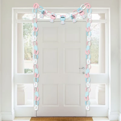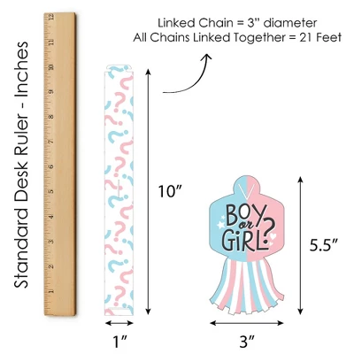 Paper Chains Garland INCLUDES: 90 paper chain links in 3 coordinating patterns and 30 paper tassels in 3 coordinating patterns. Completed paper chains garland measures approximately 21 feet, with some assembly required. One chain link SIZE 10 inches x 1 inch and one paper tassel SIZE 3 inches x 5.5 inches. SIMPLE ASSEMBLY: Baby Gender Reveal paper chain decoration kit will arrive flat and is easy enough for the whole family to assemble. First, form a chain link into a circle and insert the tab through the slit. Slide the next chain link through the first link and repeat until all chain links are connected, forming a paper chains garland. Attach paper tassels by inserting paper tassel through center slit located on the chain link. DIY PARTY SUPPLIES: Dress up all areas with Blue & Pink paper chains. Some fun decorating ideas are to wrap paper chains down a staircase railing, hang above doorways, or use as a photo booth backdrop. For an effortless look, stretch paper chains garland down the center of your dining room table. Paper chains can also be used to count down the days to a big event or trip. PREMIUM PARTY DECORATION: Paper chain decorations are professionally printed and double-sided on sturdy cardstock paper, with a photo-like shine. They are then individually cut, inspected, and carefully packaged. Baby Gender Reveal paper chains garland is a DIY kit that can be used in many ways. Get inspired with this fun do-it-yourself He or She Baby Shower Party decor kit! MADE IN THE USA: Baby Gender Reveal paper chains garland is designed and manufactured at our Wisconsin facility using materials that are Made in the USA.
