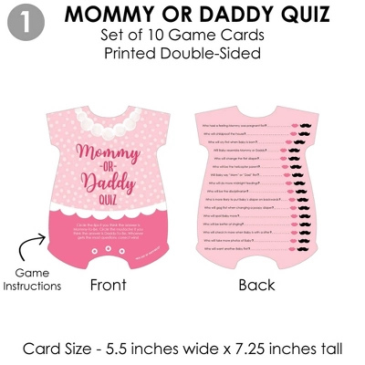 - Games Included: Who Knows Mommy Best, Mommy or Daddy Quiz, What’s in Your Purse, and Oh Baby