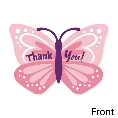 Shaped Thank You Cards Set INCLUDES 12: Beautiful Butterfly Baby Shower or Birthday Party thank you cards and 12 premium white envelopes. Pink Butterfly Shaped Thank You Cards are the perfect end to any event. Pastel Butterflies party thank you note cards SIZE 7 inches by 5 inches. The included envelopes measure to fit 7 inches by 5 inches cards. The back of each Beautiful Butterfly Baby Shower or Birthday Party thank you has space to write a personal message of thanks. PREMIUM PARTY THANK YOU CARDS: Beautiful Butterfly party thank you cards are professionally printed on heavy-duty cardstock paper with a photo-like shine. They are individually inspected, then carefully packaged with our exclusive squiggle flap envelopes, making this Beautiful Butterfly stationery set a must-have for any Baby Shower or Birthday Party. MADE IN THE USA: Beautiful Butterfly Party Thank You Cards are designed and manufactured at our Wisconsin facility using materials that are Made in America.