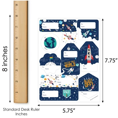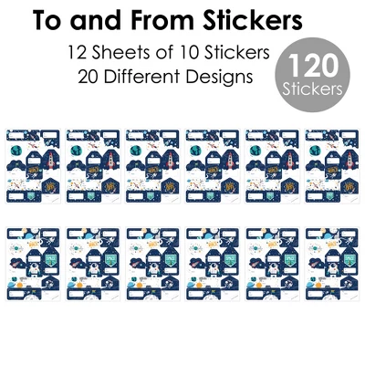 Each Rocketship Themed sticker sheet is professionally printed on high-quality easy-to-peel sticker paper with 10 stickers per sheet for a total of 120 stickers altogether. Whether it’s small or large, decorate your presents with a Blast Off to Outer Space To and From Sticker to add a special touch that will wow your loved ones. Blast Off to Outer Space To and From Stickers INCLUDES 12 sticker sheets with 10 stickers per sheet for a total of 120 stickers. With 20 different sticker designs, gift-giving for your Baby Shower or Birthday Party is easier than ever. ADORN GIFTS: Perfect for wrapped presents, favor bags, or cards inside envelopes, the assorted Rocketship Themed gift tag labels will add a special touch to all your gifts. Delight your friends or families and make memories when you hand them presents with Blast Off to Outer Space gift tag stickers. HIGH-QUALITY SUPPLY: Blast Off to Outer Space To and From Stickers set includes 12 total sticker sheets SIZE 5.75 inches wide x 7.75 inches tall. Each sticker sheet is professionally printed on easy-to-peel sticker paper with 10 stickers per sheet. MADE IN THE USA: Blast Off to Outer Space To and From Stickers are designed and manufactured at our Wisconsin facility using materials that are Made in the USA.
