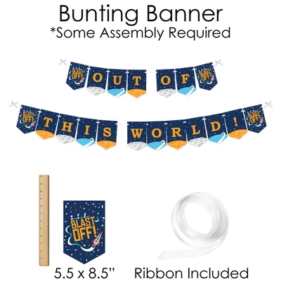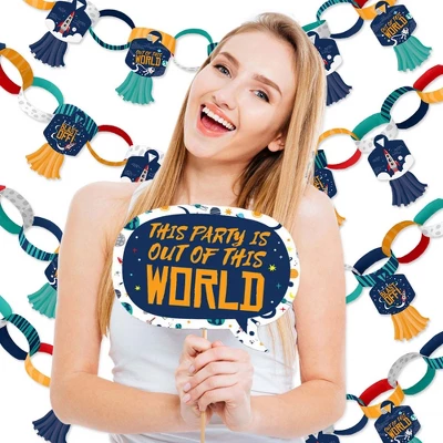 Doterrific Bundle INCLUDES: Bunting Banner “Out Of this World!”, Paper Chains Garland 21 Feet, and Funny Photo Booth Props Kit 10-Piece. Style any baby shower or birthday party with coordinating Blast Off to Outer Space-themed party supplies. Use Blast Off to Outer Space Doterrific Bundle to create an impressive photo booth backdrop. Please Note: Assembly is Required. BUNTING BANNER: Greet your party guests with a Blast Off to Outer Space bunting banner. Assemble the themed pennant flags with included ribbon and hang with the included wall mount adhesives. Each pennant measures 5.5″ wide x 8.5″ high. Satin ribbon measures 24 feet long and 3/8″ wide. Hang at the entrance of your event, at the gift table, or display as a background for photo ops. PAPER CHAINS: Blast Off to Outer Space paper chains decoration kit will arrive flat and is easy enough for the whole family to assemble. The heavy-duty paper tassels give our paper chains a unique flair. Dress up all areas of your planets party with paper chains. PHOTO PROPS: 10-Piece Funny Blast Off to Outer Space photo booth props include 4 speech bubble shapes (10.25″ wide x 8.25″ tall), 6 arrow shapes (10.5″ wide x 4.5″ tall), 10 dowel sticks (12″ tall). For easy assembly, adhesive dots and stickers are included. MADE IN THE USA: Blast Off to Outer Space Doterrific Bundle is designed and manufactured at our Wisconsin facility using materials that are Made in the USA. Professionally printed on sturdy cardstock paper with a photo-like shine, our kit parts are individually cut, inspected, and carefully packaged.