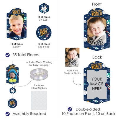 Big Dot of Happiness Blast Off to Outer Space Hanging Vertical Photo Garland includes 35 shaped pieces, 1 roll of clear cording, and assembly stickers that you can use to transform your Baby Shower or Birthday Party into an unforgettable celebration. With the 10 double-sided photo frames, insert 4 x 6 portrait photos of your guest of honor into the front and back sides. You can display up to 20 pictures using the multiple tabs to secure them into place, allowing your photo garland to look great from all angles. Delightful Decor: Blast Off to Outer Space Vertical Garland can be displayed at any length you choose for a dynamic look at your celebration. You can create a backdrop, hang it from the ceiling, or attach it above your dessert table—the possibilities are endless. DIY Assembly: Start by placing your 4 x 6 portrait pictures on the front and back sides of the photo frame cut-out pieces. Then, plan your display by laying the cut-out pieces on a flat surface. Interlock the clear cording into each cut-out piece and secure it with the provided clear stickers. Instructions are also included on the packaging. High-Quality Supply: Blast Off to Outer Space vertical hanging garland pieces are professionally printed double-sided on heavy-duty cardstock paper. Photo frames measure 5.5 inches wide x 9.25 inches tall. Circle pieces measure 4.25 inches in diameter. Hexagon cut-outs measure 3 inches wide by 3.25 inches tall. Made In The USA: Blast Off to Outer Space Photo Vertical Garlands are designed and manufactured at our Wisconsin facility using materials that are Made in the USA.