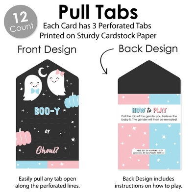 Boy Boo-y or Ghoul Pull Tabs INCLUDES 12 pull tab game cards that are suitable for a Halloween Gender Reveal Party. Each card comes with 3 tabs to choose from and instructions on the back. BREAK THE ICE: Entertaining for all! The Boy Boo-y or Ghoul pickle cards are excellent to ease the mood and use as an icebreaker. HOW TO PLAY: Hand out one pull tabs game card to each player. Players will select one tab and all at the same time easily pull it open along the perforated lines. Share the gender out loud for some good fun. HIGH-QUALITY: Boy Boo-y or Ghoul Pull Tabs are professionally printed double-sided on sturdy cardstock paper with a photo-like shine. They are individually inspected and carefully packaged by hand. MADE IN THE USA: Boy Boo-y or Ghoul Pull Tabs Game is designed and manufactured at our Wisconsin facility using materials that are Made in the USA.