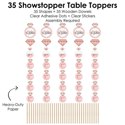 Bride Squad Showstopper Table Toppers INCLUDE: 35 heavy-duty paper centerpiece cut-outs in our Bride Squad theme. Each cut-out shape is printed double-sided and includes 35 wooden dowel sticks. DIY assembly is required. EASY TABLE DECORATIONS: Bride Squad showstopper party centerpieces come with a variety of fun shapes and in the perfect sizes to create impressive tabletop decorations. Place assembled centerpiece sticks into jars or floral arrangements for that showstopper wow-factor. DIY PARTY CENTERPIECES: Bride Squad party centerpiece kit arrives with wooden dowels and reinforcing stickers for easy DIY assembly. Simply press the included reinforcing sticker onto one dowel stick, near the end of dowel. Then, firmly press dowel to the back of a table topper shape. HIGH-QUALITY PARTY SUPPLIES: Bride Squad showstopper table toppers are professionally printed double-sided on sturdy cardstock paper with a photo-like shine. They are individually inspected and carefully packaged by hand. Showstopper table toppers will arrive unassembled, leaving your DIY bridal shower or bachelorette party idea options endless. MADE IN THE USA: Bride Squad showstopper table toppers are designed and manufactured at our Wisconsin facility using materials that are Made in the USA. Bride Squad centerpieces decorations use a No-Mess Glitter Print: Our table topper decorations are designed with a printed image of glitter, eliminating glitter flake while maximizing bling effect!