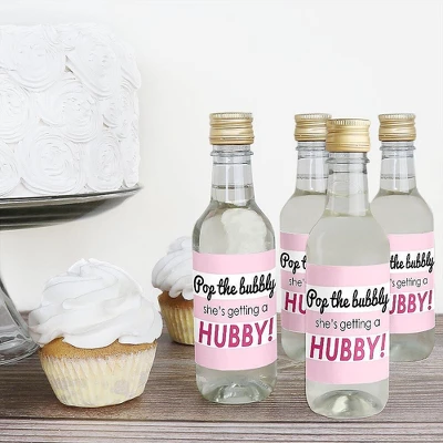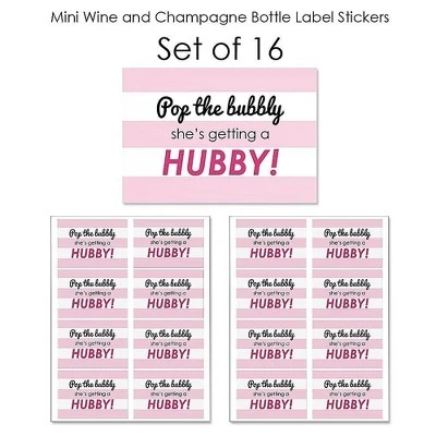 Bride-To-Be Mini Wine and Champagne Bottle Labels INCLUDES Set of 16 pop the bubbly she’s getting a hubby! single-serve bottle sticker labels in the Bride-To-Be theme, perfect for a bridal shower or bachelorette party gift. Mini wine and champagne bottle label each SIZE 3.75 inches wide x 2.6 inches tall to fit small, single-serve bottles. EASY TO USE: Prepare your beverage bottles by ensuring they are room temperature. Removing the original bottle label is not necessary. Carefully peel one adhesive Bride-To-Be Mini Wine Bottle Label from the backing and adhere to a bottle, starting at the left edge and rolling to the opposite edge. Press down to smooth. HIGH QUALITY PARTY FAVORS: Bride-To-Be mini wine and champagne bottle labels are professionally printed on a sticker paper with a glossy coating. They are waterproof and can be used on bottles that will be chilled, just be sure to apply prior to chilling. Add them single-serve bottles at each place setting for an impressive, coordinated bridal shower or bachelorette party gift. UNIQUE GIFT IDEA: Bride-To-Be Mini Wine Bottle Labels also make a great gift idea. Add Mini Wine and Champagne Bottle Label Stickers to a variety of single-serve wine and spirits bottles for a special gift or party game winner prize. Wine bottle labels will easily give you bridal shower or bachelorette party a personal touch! MADE IN THE USA: Bride-To-Be Mini Wine and Champagne Bottle Label Stickers are made at our Wisconsin facility using materials that are Made in the USA. Please Note: Mini bottles in image are not included.