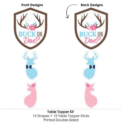 Buck or Doe Centerpiece Sticks INCLUDES 15 Cute Pink & Blue Deer Themed table toppers in three different shapes, 15 sticks, and stickers for easy assembly. Cute Pink & Blue Deer party table decorations are perfect for a Hunting Gender Reveal Party. Buck or Doe Party Centerpiece Sticks SIZE 5 – “Buck or Doe?” Shape 1 Table Toppers (8.5” x 10.75”), 5 – Blue Deer Shape 2 Table Toppers (4.25” x 7.75”), and 5 – Pink Deer Shape 3 Table Toppers (3.75” x 7”). The unique design and variety of pieces makes this table decoration kit an impressive addition to any Cute Pink & Blue Deer theme party. EASY PARTY DECOR: Buck or Doe table decorations can be used as centerpieces when attached to the included sticks and inserted into vases or floral arrangements. They easily accent your Hunting Gender Reveal Party candy buffet when you add them to apothecary jars. Table toppers are also a great addition to any photo booth. The large, shaped cut outs will make your party pics instantly shareable. Cute Pink & Blue Deer party centerpiece sticks are sure to make a statement however you choose to use them! PREMIUM PARTY SUPPLIES: Buck or Doe party table toppers are professionally printed on heavy-duty cardstock paper with a photo-like shine. They are individually inspected and carefully packaged by hand with sticks and stickers for easy assembly. Get creative with your DIY party ideas! MADE IN THE USA: Buck or Doe Party Centerpiece Sticks are designed and manufactured at our Wisconsin facility using materials that are Made in America.