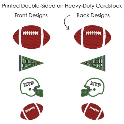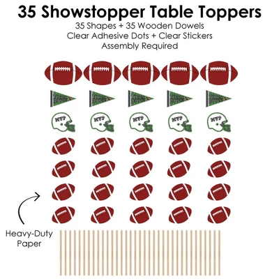 End Zone – Football Showstopper Table Toppers INCLUDE: 35 heavy-duty paper centerpiece cut-outs in our End Zone – Football theme. Each cut-out shape is printed double-sided and includes 35 wooden dowel sticks. DIY assembly is required. EASY TABLE DECORATIONS: End Zone – Football showstopper party centerpieces come with a variety of fun shapes and in the perfect sizes to create impressive tabletop decorations. Place assembled centerpiece sticks into jars or floral arrangements for that showstopper wow-factor. DIY PARTY CENTERPIECES: End Zone – Football party centerpiece kit arrives with wooden dowels and reinforcing stickers for easy DIY assembly. Simply press the included reinforcing sticker onto one dowel stick, near the end of dowel. Then, firmly press dowel to the back of a table topper shape. HIGH-QUALITY PARTY SUPPLIES: End Zone – Football showstopper table toppers are professionally printed double-sided on sturdy cardstock paper with a photo-like shine. They are individually inspected and carefully packaged by hand. Showstopper table toppers will arrive unassembled, leaving your DIY baby shower or birthday party idea options endless. MADE IN THE USA: End Zone – Football showstopper table toppers are designed and manufactured at our Wisconsin facility using materials that are Made in the USA.