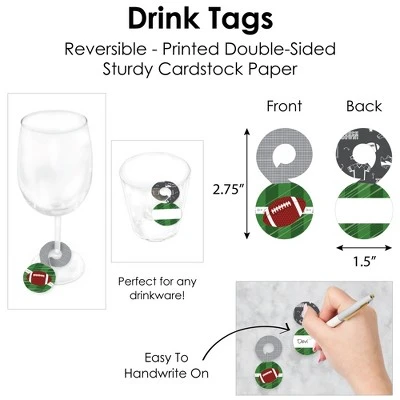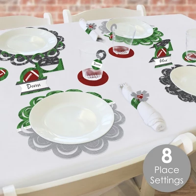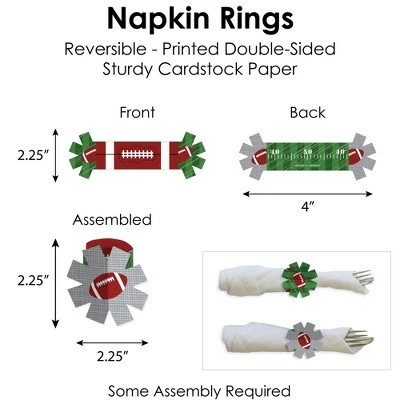 Paper Chargers: Includes 8 scalloped-edge table decorations that are the perfect base for your meal plates. Each place setting charger measures 11.25” in diameter and is a great substitute for a paper doily. They come with a scallop border that can be flared up for an elevated look. Professionally printed double-sided on sturdy cardstock paper, paper chargers are reversible for an alternate look. Napkin Rings: Includes 8 DIY End Zone – Football paper napkin rings with tassel-shaped ends. Professionally printed double-sided on sturdy cardstock paper, each napkin ring holder is reversible and measures 2.25” wide by 2.25” tall when assembled. To use, carefully curve each ring without creasing and connect by interlocking the tassel-shaped ends together. Sports Drink Tags: Includes 8 paper drink charms that are perfect for accessorizing your drinkware. Each beverage tag is professionally printed double-sided on sturdy cardstock paper with space on the backside for handwritten personalization. Drink tags measure 1.5” wide by 2.75” and will look great on the stem of a glass or on the rim of your cup. Place Cards: Includes 8 End Zone – Football name cards that are professionally printed double-sided on sturdy cardstock paper and measure 3.5” wide by 2.5” tall when assembled. To use, push back the top outer edge, revealing the half-circle top. Fold along the pre-scored line in the center to create the tent shape, and then display! Paper Coasters: Includes 8 Sports themed reversible circles that perfectly highlight your drinkware. Each beverage coaster is professionally printed double-sided on sturdy cardstock paper and measures 4” in diameter.