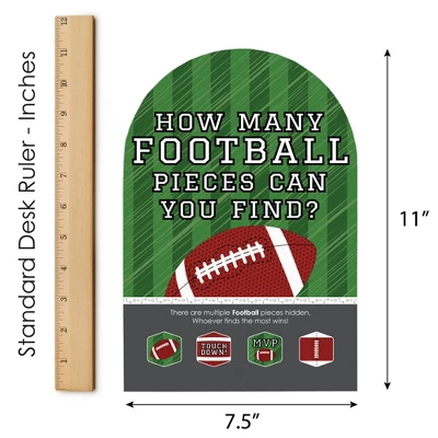 End Zone – Football Hide and Find Game INCLUDES 1 sign with a built-in stand and 48 hexagon game pieces that you can hide for an exhilarating scavenger hunt at your Birthday Party or Baby Shower. Easy Assembly: End Zone – Football game sign comes with built-in stand and requires some easy DIY assembly. To display your sign, fold the sides of the stand towards the center. Then, fold down the support piece of the stand until it rests in the notches. How To Play: Hide and find game sign shows the design of each hexagon piece, so display on a table where everyone can see. Then, find creative places to hide the game pieces around your venue. Finally, send your guests to hunt for the pieces. Whoever finds the most pieces wins! For a twist, divide the guests into teams and assign each team a piece to hunt for. High-Quality Supply: Sports Themed Hide and Find Game is professionally printed double-sided on heavy-duty cardstock paper with a photo-like shine. Sign measures 7.5” wide by 11” tall and hexagon pieces measure 2.25” wide by 2.25” tall. Made In The USA: End Zone – Football Hide and Find Game is designed and manufactured at our Wisconsin facility using materials that are Made in the USA.