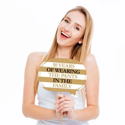 10-Piece Funny 50th Wedding Anniversary Photo Booth Props Kit INCLUDES 10 Anniversary arrow and speech bubble photo booth props, 10 sticks and adhesives for assembly. EASY ASSEMBLY: Simply attach the printed DIY photo booth props to the sticks with included adhesive and reinforcing stickers. PERFECT FOR ANY CROWD! Photo booth props are fun 50th Wedding Anniversary party supplies for adults and kids – everyone will love the funny sayings on these Anniversary photo booth props. Take entertaining and shareable party photos while making memories with these funny photo booth props! 50th WEDDING ANNIVERSARY DECORATIONS: Many fun ways to use these cute photo booth props! Use as intended and take party photos to share; Add them to vases and floral arrangements as a fun 50th Wedding Anniversary centerpiece; Accent your Wedding Anniversary candy buffet by displaying them in apothecary candy jars; Adhere as direction arrows to walls and guide your guests to the Anniversary party! HIGH-QUALITY: 50th Wedding Anniversary photo booth props are professionally printed on thick cardstock paper. They will arrive cut out and ready to assemble with the included sticks and adhesives. Wedding Anniversary photo booth props use a No-Mess Glitter Print: Our photo booth props are designed with a printed image of glitter, eliminating glitter flake while maximizing bling effect! MADE IN THE USA: Funny 50th Wedding Anniversary Photo Booth Props Kit is designed and manufactured at our Wisconsin facility using materials that are Made in the USA.
