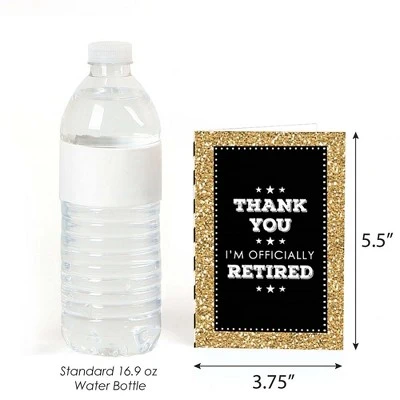 Happy Retirement Thank You Note Card Set INCLUDES 8 black and gold party thank yous and premium white envelopes. Retirement thank you notes are perfect for any event. Happy Retirement note cards SIZE 5.5 inches by 3.75 inches, folded. The included envelopes measure 5.75 inches by 3.75 inches. The inside of each Happy Retirement thank you card stationery has a fun graphic as well as space to write a special note to friends and family. PREMIUM THANK YOU CARDS: Happy Retirement thank you cards are professionally printed on heavy-duty card stock paper with a photo-like shine. They are hand-folded and individually inspected, then carefully packaged with our exclusive squiggle flap envelopes, making this retirement stationary set a must-have for retirement party. MADE IN THE USA: Happy Retirement – Retirement Party Thank You Cards are designed and manufactured at our Wisconsin facility using materials that are Made in the USA. Retirement thank you cards use a No-Mess Glitter Print: Our thank you cards are designed with a printed image of glitter, eliminating glitter flake while maximizing bling effect!