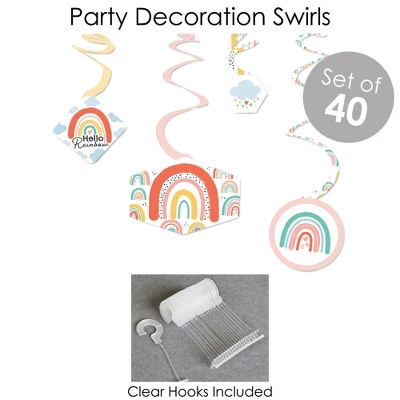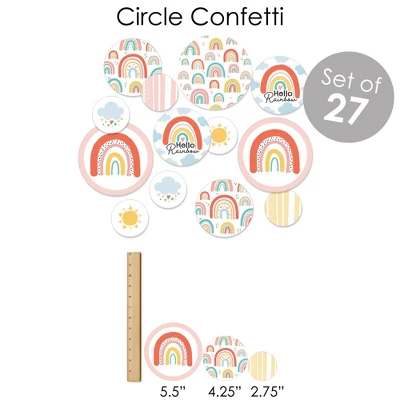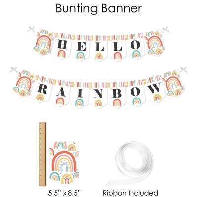 BUNTING BANNER includes: letter and themed pennants. Each pennant measures 8.5″ high x 5.5″ wide. Pennants are numbered in sequence and ribbon is included for easy assembly. PARTY DECORATION SWIRLS includes: 4 different shapes, 10 count per shape, that hang below an accordion-style spiral. Professionally printed double-sided, each decoration swirl in the 40-piece set has a pre-cut hole for easy assembly using the included clear hooks. Party decoration swirls will arrive flat. TABLE TOPPERS includes: 15 Hello Rainbow centerpiece sticks in three different shapes, each professionally printed double-sided. To use as centerpieces or photo props, wooden dowels and assembly stickers are included. CIRCLE CONFETTI includes: three different sizes of circles – 12 small circles, size 2.75″, 9 medium circles, size 4.25″, and 6 large circles, size 5.5″. Professionally printed double-sided with coordinating Boho Rainbow designs, circle confetti can be scattered around your table. FAVOR KIT: CANDY STICKERS includes: 2 sheets mini candy bar wrappers (total 40), 2 sheets round candy stickers (total 216), 2 sheets circle stickers (total 48). Easy assembly with this peel and stick favor kit. Simply center and press stickers onto your favorite candies to style candy buffets or decorate take-home favors for party guests. Note: Candy is not included.