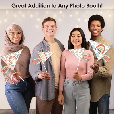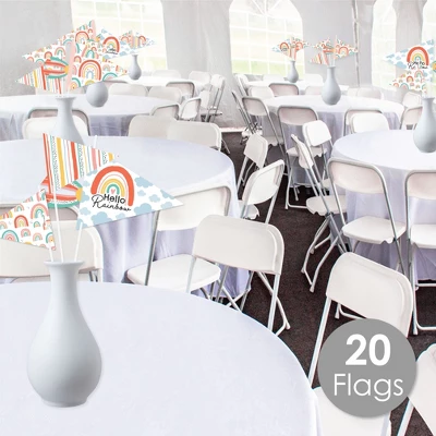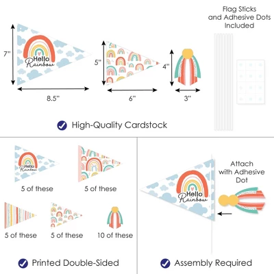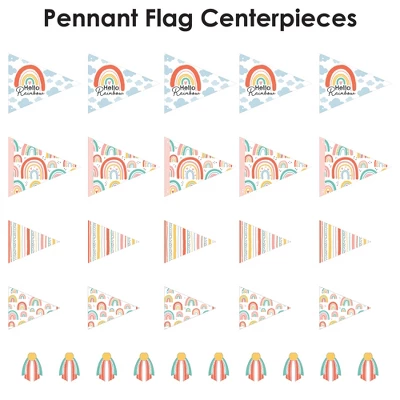 Big Dot of Happiness Hello Rainbow Pennant Flag Centerpieces include a set of 20 paper triangle flags, 10 paper tassel shapes, paper sticks, and adhesive dots. Pennant centerpieces will help create an impressive look at your Baby Shower or Birthday Party. Party Decor: Make a statement with the Boho table decorations at your celebration. Insert them into vases or floral arrangements and place them at the center of your tablescape. They are the perfect way to accent your tables and are also a great addition to any photo booth. Easy DIY: Hello Rainbow flag decorations come with sticks and adhesive dots for easy assembly. Simply insert a stick into the holes on the side of a pennant triangle and attach a paper tassel with an included adhesive dot. Then, begin arranging your centerpiece decorations! High-Quality Supply: Hello Rainbow flags are professionally printed double-sided on heavy-duty cardstock paper with a photo-like shine. Large pennants measure 8.5 inches wide by 7 inches tall, small pennants measure 6 inches wide by 5 inches tall, and paper tassels measure 3 inches wide by 4 inches tall. Assembled In The USA: Hello Rainbow Pennant Flag Centerpieces are designed and manufactured at our Wisconsin facility using materials that are Made in the USA – Sticks Made in China.