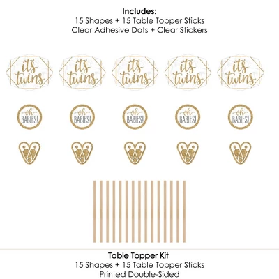 It’s Twins – Gold Centerpiece Sticks INCLUDES 15 It’s Twins – Gold table toppers in three different shapes, 15 sticks and stickers for easy assembly. Oh babies party table decorations are perfect for a baby shower. It’s Twins – Gold Party Centerpiece Sticks SIZE five It’s Twins – Gold table toppers, 10.75″ wide x 8.5″ tall; five pins table toppers, 5″ wide x 5.25″ tall; and five circles table toppers, 5.75″ wide x 5.75″ tall. The unique design and variety of pieces makes this table decoration kit an impressive addition to any twins theme party. EASY PARTY DECOR: It’s Twins – Gold table decorations can be used as centerpieces when attached to the included sticks and inserted into vases or floral arrangements. They easily accent your baby shower candy buffet when you add them to apothecary jars. Table toppers are also a great addition to any photo booth. The large shaped cut outs will make your party pics instantly shareable. It’s Twins – Gold centerpiece sticks are sure to make a statement however you choose to use them! PREMIUM PARTY SUPPLIES: It’s Twins – Gold party table toppers are professionally printed on heavy-duty cardstock paper with a photo-like shine. They are individually inspected and carefully packaged by hand with sticks and stickers for easy assembly. Get creative with your DIY party ideas! MADE IN THE USA: It’s Twins – Gold – Baby Shower Centerpiece Sticks are designed and manufactured at our Wisconsin facility using materials that are Made in America. Twins decoration kit uses a No-Mess Glitter Print: Our decor kit is designed with a printed image of glitter, eliminating glitter flake while maximizing bling effect!