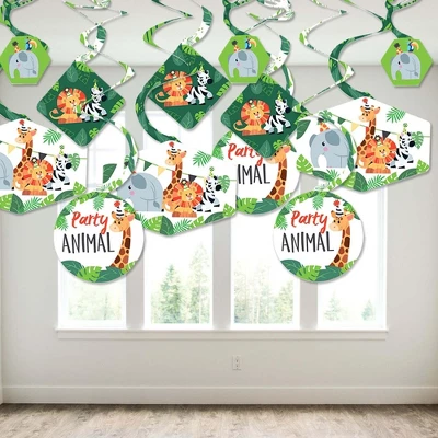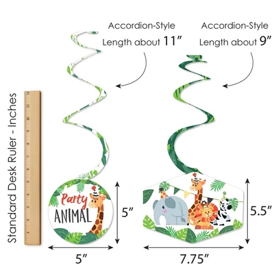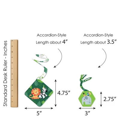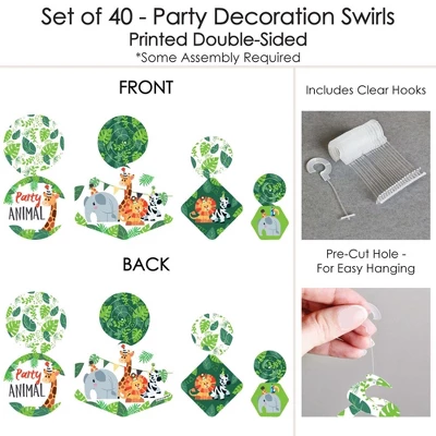 Party Decoration Swirls – Set of 40 INCLUDES 4 different shapes, 10 count per shape, that hang below an accordion-style spiral with included clear hooks. 10 swirls SIZE 5 inches x 5 inches with length about 11 inches. 10 swirls, SIZE 7.75 inches x 5.5 inches with length about 9 inches. 10 swirls, SIZE 5 inches x 4.75 inches with length about 4 inches. 10 swirls, SIZE 3 inches x 2.75 inches with length about 3.5 inches. PERFECT FOR ANY EVENT: With different hanging lengths and a variety of shapes and sizes, Party Decoration Swirls are perfect for baby shower or birthday parties. Add a pop of color when displayed over the gift table or dessert buffet. Or, add your own string if you would like them to hang lower in your party space. EASY TO USE: Each decoration swirl in the 40-piece set has a pre-cut hole for easy assembly using the included clear hooks. Party decoration swirls will arrive flat. Take a clear hook and insert the bottom bar into the pre-cut hole. Once the clear hook is fastened, gently stretch the swirl and hang it up. HIGH-QUALITY PARTY SUPPLY: Jungle Party Animals Party Decoration Swirls are professionally printed and double-sided on heavy-duty cardstock paper. They are individually cut, inspected, and carefully packaged. Each swirl will use one clear hook. MADE IN THE USA: Party Decoration Swirls are designed and manufactured at our Wisconsin facility using materials that are Made in the USA.
