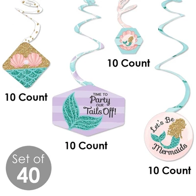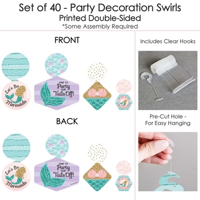 Party Decoration Swirls – Set of 40 INCLUDES 4 different shapes, 10 count per shape, that hang below an accordion-style spiral with included clear hooks. 10 swirls SIZE 5 inches x 5 inches with length about 11 inches. 10 swirls SIZE 7.75 inches x 5.5 inches with length about 9 inches. 10 swirls SIZE 5 inches x 4.75 inches with length about 4 inches. 10 swirls SIZE 3 inches x 2.75 inches with length about 3.5 inches. PERFECT FOR ANY EVENT: With different hanging lengths and variety of shapes and sizes, party decoration swirls are perfect for baby shower or birthday parties. Add a pop of color when displayed over the gift table or dessert buffet. Or add your own string if you would like them to hang lower in your party space. EASY TO USE: Each decoration swirl in the 40-piece set has a pre-cut hole for easy assembly using the included clear hooks. Party decoration swirls will arrive flat. Take a clear hook and insert the bottom bar into the pre-cut hole. Once the clear hook is fastened, gently stretch the swirl and hang it up. HIGH-QUALITY PARTY SUPPLY: Let’s Be Mermaids Party Decoration Swirls are professionally printed and double-sided on heavy-duty cardstock. They are individually cut, inspected, and carefully packaged. Each swirl will use one clear hook. MADE IN THE USA: Party Decoration Swirls Set is designed and manufactured at our Wisconsin facility using materials that are Made in the USA. Let’s Be Mermaids party decoration kit uses a No-Mess Glitter Print: Our party kits are designed with a printed image of glitter, eliminating glitter flake while maximizing bling effect!