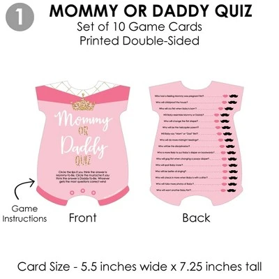 Little Princess Crown Gamerific Bundle INCLUDES 4 baby shower games with 10 game cards per each game. BABY SHOWER GAMES: Guests will have fun playing 4 different baby shower games: Mommy or Daddy Quiz, Who Knows Mommy Best, What’s in Your Purse, and Oh Baby! Each game is shaped like popular baby items: baby bodysuit, diaper, baby rattle, and baby bottle. HOW TO PLAY: Each game card is printed with easy-to-follow game instructions. For added fun, make each game extra competitive by adding a time limit and offering a prize to the winning party guest. HIGH-QUALITY: Little Princess Crown Baby Shower Games are professionally printed and double-sided on sturdy cardstock paper. They are individually inspected and carefully packaged by hand. This fun baby shower game set will arrive ready to play. MADE IN THE USA: Little Princess Crown Baby Shower Gamerific Bundle is designed and manufactured at our Wisconsin facility using materials that are Made in the USA. Little Princess Crown Game Cards use a No-Mess Glitter Print: Our party games are designed with a printed image of glitter, eliminating glitter flake while maximizing bling effect!
