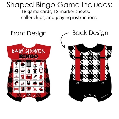 Lumberjack – Channel the Flannel – Shaped Picture Bingo Cards and Markers INCLUDES 18 game cards, 18 perforated marker sheets, 1 perforated call sheet, and game instructions. MUST-HAVE PARTY SUPPLY: Bingo is an easy and classic baby shower game that everyone will have fun playing. Lumberjack – Channel the Flannel – Shaped Picture Bingo Cards and Markers give this classic game a fresh look with baby bodysuit-shaped playing cards and baby related pictures instead of numbers. HOW TO PLAY: Begin play by the designated bingo leader pulling a caller chip from the bowl. Each guest covers the called picture on their card with square marker. Continue until a guest has covered a row of pictures in any direction – vertically, horizontally, or diagonally and calls out “BINGO!”. HIGH-QUALITY: Lumberjack – Channel the Flannel Picture Shaped Bingo Cards and Markers are professionally printed and double-sided on sturdy cardstock paper. They are individually inspected and carefully packaged by hand. Each baby bodysuit-shaped card measures 5.25” Wide x 6.75” Tall, perforated marker sheets measure 2.75” Wide x 5” Tall and individual markers measure 0.75” Wide x 0.75” Tall. MADE IN THE USA: Lumberjack – Channel the Flannel – Shaped Bingo Cards and Markers are designed and manufactured at our Wisconsin facility using materials that are Made in the USA.