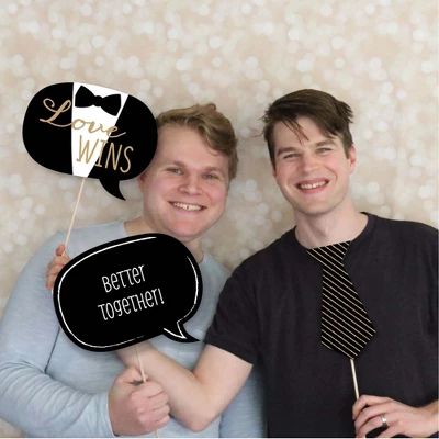20-Piece LGBTQ Photo Booth Props Kit INCLUDES 20 Mr. & Mr. – Gold photo booth props, 20 sticks and adhesives for assembly. EASY ASSEMBLY: Simply attach the printed DIY photo booth props to the sticks with included adhesive and reinforcing stickers. PERFECT FOR ANY CROWD! Photo booth props are fun wedding party supplies for adults and kids – everyone will love the funny faces on these Mr. & Mr. – Gold photo booth props. Take entertaining and shareable party photos of your friends and family while making memories with these stylish photo booth props! WEDDING DECORATION IDEAS: There are many fun ways to use these cute photo booth props! Use as intended at your wedding and take party photos to share; add them to vases and floral arrangements as a fun black and gold centerpiece; or accent your gay wedding theme by displaying them in decorative candy jars! HIGH-QUALITY PARTY SUPPLIES: Mr. & Mr. – Gold photo booth props are professionally printed on thick cardstock paper. They will arrive cut out and ready to assemble with the included sticks and adhesives. Mr. & Mr. – Gold photo booth props use a No-Mess Glitter Print: Our photo booth props are designed with a printed image of glitter, eliminating glitter flake while maximizing bling effect! MADE IN THE USA: Mr. & Mr. – Gold – Gay Wedding LGBTQ Photo Booth Props Kit is designed and manufactured at our Wisconsin facility using materials that are Made in the USA.