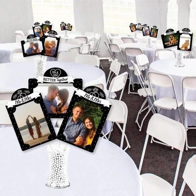 Mr. and Mrs. – Black and White Photo Table Toppers INCLUDE: 15 sturdy and professionally printed paper photo holders and 15 table topper sticks. Each photo holder has pre-cut tabs to display your 4×6 photos vertically or horizontally. Clear stickers are included to easily assemble the stick to photo holder. DIY CENTERPIECE STICKS: Create picture-perfect centerpieces for your wedding or bridal shower with Mr. and Mrs. – Black and White Photo Table Toppers. Each photo holder has 4 pre-cut slits to tab your 4×6 photos in place. (Note: Your photo will tab through back design of photo holder.) Then attach one table topper stick to one completed photo holder piece with the included clear stickers. EASY BRIDAL SHOWER OR WEDDING DECOR: Mr. and Mrs. – Black and White Photo Table Topper decorations can be used as centerpieces when attached to the included sticks and inserted into vases or floral arrangements. They easily accent your wedding or bridal shower candy buffet when you add them to apothecary jars. Photo Table Toppers are a great addition to any wedding or bridal shower and a fun way to proudly show off the guest of honor. PREMIUM PARTY DECORATION: Mr. and Mrs. – Black and White Photo Table Toppers are professionally printed double-sided on heavy-duty cardstock paper. This set of paper picture frames includes 10 count vertical photo display SIZE 5.5 inches wide x 8.75 inches tall and 5 count horizontal photo display SIZE 7.5 inches wide x 6.75 inches tall. Each photo holder fits your own 4×6 photo size. The included 15 table topper sticks each SIZE 12 inches tall. Do-it-yourself assembly required. MADE IN THE USA: Mr. and Mrs. – Black and White Photo Table Toppers are designed and manufactured at our Wisconsin facility using materials that are Made in the USA.