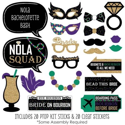 20-Piece Bachelorette Photo Booth Props Kit INCLUDES 20 NOLA Bride Squad – New Orleans photo booth props, 20 sticks and stickers for assembly. EASY ASSEMBLY: Simply attach the printed DIY photo booth props to the sticks with included reinforcing stickers. PERFECT FOR ANY CROWD! Photo booth props are fun bachelorette party supplies for adults and kids – everyone will love the funny faces on these NOLA Bride Squad – New Orleans Bachelorette photo booth props. Take entertaining and shareable party photos of your friends and family while making memories with these funny photo booth props! BACHELORETTE DECORATIONS: There are many fun ways to use these cute photo booth props! Use as intended at home, school or work and take party photos to share; add them to vases and floral arrangements as a fun NOLA Bride Squad – New Orleans bachelorette centerpiece; or accent your New Orleans candy buffet by displaying them in apothecary candy jars! HIGH-QUALITY PARTY SUPPLIES: NOLA Bride Squad – New Orleans Bachelorette photo booth props are professionally printed on thick cardstock paper. They will arrive cut out and ready to assemble with the included sticks and stickers. NOLA New Orleans photo booth props use a No-Mess Glitter Print: Our photo booth props are designed with a printed image of glitter, eliminating glitter flake while maximizing bling effect! MADE IN THE USA: NOLA Bride Squad – New Orleans Bachelorette Party Photo Booth Props Kit is designed and manufactured at our Wisconsin facility using materials that are Made in the USA.