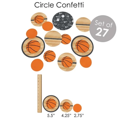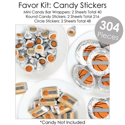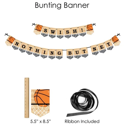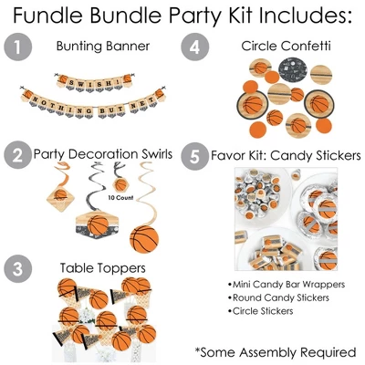 BUNTING BANNER includes: letter and themed pennants. Each pennant measures 8.5″ high x 5.5″ wide. Pennants are numbered in sequence and ribbon is included for easy assembly. PARTY DECORATION SWIRLS includes: 4 different shapes, 10 count per shape, that hang below an accordion-style spiral. Professionally printed double-sided, each decoration swirl in the 40-piece set has a pre-cut hole for easy assembly using the included clear hooks. Party decoration swirls will arrive flat. TABLE TOPPERS includes: 15 Nothin’ but Net – Basketball centerpiece sticks in three different shapes, each professionally printed double-sided. To use as centerpieces or photo props, wooden dowels and assembly stickers are included. CIRCLE CONFETTI includes: three different sizes of circles – 12 small circles, size 2.75″, 9 medium circles, size 4.25″, and 6 large circles, size 5.5″. Professionally printed double-sided with coordinating basketball designs, circle confetti can be scattered around your table. FAVOR KIT: CANDY STICKERS includes: 2 sheets mini candy bar wrappers (total 40), 2 sheets round candy stickers (total 216), 2 sheets circle stickers (total 48). Easy assembly with this peel and stick favor kit. Simply center and press stickers onto your favorite candies to style candy buffets or decorate take-home favors for party guests. Note: Candy is not included.