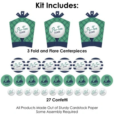Par-Tee Time – Golf Terrific Table Centerpiece Kit INCLUDES 27 paper confetti and 3 fold and flare centerpieces that will look amazing at your Retirement or Birthday Party. Make a statement at your celebration with this easy DIY table kit! CIRCLE CONFETTI includes 27 cut-out circle shapes in three different sizes – 12 small circles size 2.75 in, 9 medium circles size 4.25 in, and 6 large circles size 5.5 in. Scatter the Gold Outing themed confetti across your dessert or buffet table for an impressive addition to your decorations. FOLD AND FLARE CENTERPIECES includes 3 table decorations measure 5 inches wide (front/back) x 3 inches wide (sides) x 10.5 inches tall. These paper table decors require easy folding to flare out each centerpiece for your desired look. Simply, use a flat surface to fold along the scored creases to stand the centerpiece upright and be able to balance on its own. Both Fold and Flare Centerpieces & Confetti Are Professionally Printed Double-Sided on Sturdy Cardstock Paper MADE IN THE USA: Par-Tee Time – Golf Terrific Table Centerpiece Kit is designed and manufactured at our Wisconsin facility using materials that are Made in the USA.