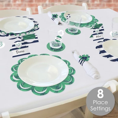 Paper Chargers: Includes 8 scalloped-edge table decorations that are the perfect base for your meal plates. Each place setting charger measures 11.25” in diameter and is a great substitute for a paper doily. They come with a scallop border that can be flared up for an elevated look. Professionally printed double-sided on sturdy cardstock paper, paper chargers are reversible for an alternate look. Napkin Rings: Includes 8 DIY Par-Tee Time – Golf paper napkin rings with tassel-shaped ends. Professionally printed double-sided on sturdy cardstock paper, each napkin ring holder is reversible and measures 2.25” wide by 2.25” tall when assembled. To use, carefully curve each ring without creasing and connect by interlocking the tassel-shaped ends together. Blue and Green Drink Tags: Includes 8 paper drink charms that are perfect for accessorizing your drinkware. Each beverage tag is professionally printed double-sided on sturdy cardstock paper with space on the backside for handwritten personalization. Drink tags measure 1.5” wide by 2.75” and will look great on the stem of a glass or on the rim of your cup. Place Cards: Includes 8 Par-Tee Time – Golf name cards that are professionally printed double-sided on sturdy cardstock paper and measure 3.5” wide by 2.5” tall when assembled. To use, push back the top outer edge, revealing the half-circle top. Fold along the pre-scored line in the center to create the tent shape, and then display! Paper Coasters: Includes 8 Blue and Green themed reversible circles that perfectly highlight your drinkware. Each beverage coaster is professionally printed double-sided on sturdy cardstock paper and measures 4” in diameter.