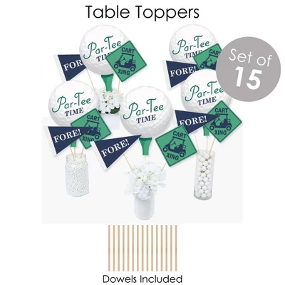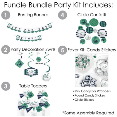 BUNTING BANNER includes: letter and themed pennants. Each pennant measures 8.5″ high x 5.5″ wide. Pennants are numbered in sequence and ribbon is included for easy assembly. PARTY DECORATION SWIRLS includes: 4 different shapes, 10 count per shape, that hang below an accordion-style spiral. Professionally printed double-sided, each decoration swirl in the 40-piece set has a pre-cut hole for easy assembly using the included clear hooks. Party decoration swirls will arrive flat. TABLE TOPPERS includes: 15 Par-Tee Time – Golf centerpiece sticks in three different shapes, each professionally printed double-sided. To use as centerpieces or photo props, wooden dowels and assembly stickers are included. CIRCLE CONFETTI includes: three different sizes of circles – 12 small circles, size 2.75″, 9 medium circles, size 4.25″, and 6 large circles, size 5.5″. Professionally printed double-sided with coordinating golf designs, circle confetti can be scattered around your table. FAVOR KIT: CANDY STICKERS includes: 2 sheets mini candy bar wrappers (total 40), 2 sheets round candy stickers (total 216), 2 sheets circle stickers (total 48). Easy assembly with this peel and stick favor kit. Simply center and press stickers onto your favorite candies to style candy buffets or decorate take-home favors for party guests. Note: Candy is not included.
