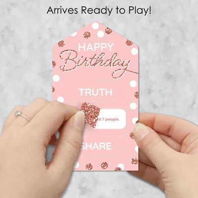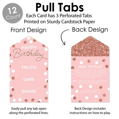 Pink Rose Gold Birthday Pull Tabs INCLUDES 12 pull tab game cards that are suitable for a Birthday Party. Each card comes with 3 tabs to choose from and instructions on the back. BREAK THE ICE: Entertaining for all! The Pink Rose Gold Birthday pickle cards are excellent to ease the mood and use as an icebreaker. Trade cards with others and open a new tab for more entertainment! HOW TO PLAY: Hand out one pull tabs game card to each player. Players will select one tab and easily pull it open along the perforated lines. Share the Truths/Dares/Shares out loud for some good fun. HIGH-QUALITY: Elegant Girl Pull Tabs are professionally printed double-sided on sturdy cardstock paper with a photo-like shine. They are individually inspected and carefully packaged by hand. MADE IN THE USA: Pink Rose Gold Birthday Pull Tabs Game is designed and manufactured at our Wisconsin facility using materials that are Made in the USA. Pink Rose Gold Birthday Pull Tabs uses a No-Mess Glitter Print: Our Pull Tabs are designed with a printed image of glitter, eliminating glitter flake while maximizing bling effect!