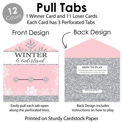 Pink Winter Wonderland Pull Tabs 3-in-a-Row INCLUDES 12 pull tab game cards with 1 winning card and 11 losing cards. Great for a Winter Holiday Snowflake Birthday Party and Baby Shower, these game cards are for entertainment purposes only. FUN FOR ALL: The Pink Winter Wonderland 3-in-a-Row pickle cards can be played by children and adults. Itβs the perfect way to add excitement to your event! Prize is determined by the event host. HOW TO PLAY: Hand out one Pull Tab Game Card to each player. Players will then pull each tab open along the perforated lines. If there are three matching icons in a row, the player wins! HIGH-QUALITY: Pink Winter Wonderland Pull Tabs 3-in-a-Row Cards are professionally printed double-sided on sturdy cardstock paper with a photo-like shine. They are individually inspected and carefully packaged by hand. MADE IN THE USA: Pink Winter Wonderland Pull Tabs 3-in-a-Row is designed and manufactured at our Wisconsin facility using materials that are Made in the USA. Pink Winter Wonderland Pull Tabs uses a No-Mess Glitter Print: Our Pull Tabs are designed with a printed image of glitter, eliminating glitter flake while maximizing bling effect!