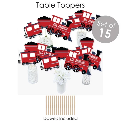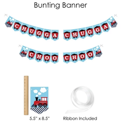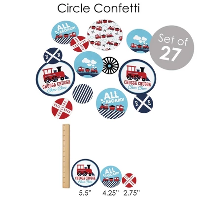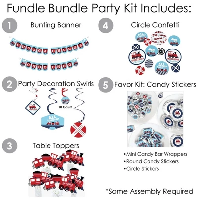 BUNTING BANNER includes: letter and themed pennants. Each pennant measures 8.5″ high x 5.5″ wide. Pennants are numbered in sequence and ribbon is included for easy assembly. PARTY DECORATION SWIRLS includes: 4 different shapes, 10 count per shape, that hang below an accordion-style spiral. Professionally printed double-sided, each decoration swirl in the 40-piece set has a pre-cut hole for easy assembly using the included clear hooks. Party decoration swirls will arrive flat. TABLE TOPPERS includes: 15 Railroad Party Crossing centerpiece sticks in three different shapes, each professionally printed double-sided. To use as centerpieces or photo props, wooden dowels and assembly stickers are included. CIRCLE CONFETTI includes: three different sizes of circles – 12 small circles, size 2.75″, 9 medium circles, size 4.25″, and 6 large circles, size 5.5″. Professionally printed double-sided with coordinating steam train designs, circle confetti can be scattered around your table. FAVOR KIT: CANDY STICKERS includes: 2 sheets mini candy bar wrappers (total 40), 2 sheets round candy stickers (total 216), 2 sheets circle stickers (total 48). Easy assembly with this peel and stick favor kit. Simply center and press stickers onto your favorite candies to style candy buffets or decorate take-home favors for party guests. Note: Candy is not included.