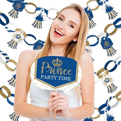 Doterrific Bundle INCLUDES: Bunting Banner “It’s A Royal Celebration”, Paper Chains Garland 21 Feet, and Funny Photo Booth Props Kit 10-Piece. Style any baby shower or birthday party with coordinating Royal Prince Charming-themed party supplies. Use Royal Prince Charming Doterrific Bundle to create an impressive photo booth backdrop. Please Note: Assembly is Required. BUNTING BANNER: Greet your party guests with a Royal Prince Charming bunting banner. Assemble the themed pennant flags with included ribbon and hang with the included wall mount adhesives. Each pennant measures 5.5″ wide x 8.5″ high. Satin ribbon measures 24 feet long and 3/8″ wide. Hang at the entrance of your event, at the gift table, or display as a background for photo ops. PAPER CHAINS: Royal Prince Charming paper chains decoration kit will arrive flat and is easy enough for the whole family to assemble. The heavy-duty paper tassels give our paper chains a unique flair. Dress up all areas of your prince charming party with paper chains. For decorating fun, wrap paper chains down a staircase railing or use as a photo backdrop. PHOTO PROPS: 10-Piece Funny Royal Prince Charming photo booth props include 4 speech bubble shapes (10.25″ wide x 8.25″ tall), 6 arrow shapes (10.5″ wide x 4.5 inches) tall, 10 dowel sticks (12″ tall). For easy assembly, adhesive dots and stickers are included. Use photo props and dowels as centerpieces or scatter props throughout your event space for even more party fun. MADE IN THE USA: Royal Prince Charming Doterrific Bundle is designed and manufactured at our Wisconsin facility using materials that are Made in the USA. Professionally printed on sturdy cardstock paper with a photo-like shine. Royal Prince Charming Doterrific Bundle Kit use a No-Mess Glitter Print: Our DIY party decorations are designed with a printed image of glitter, eliminating glitter flake while maximizing bling effect!