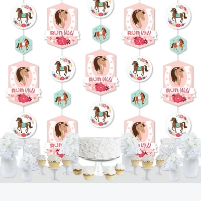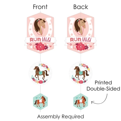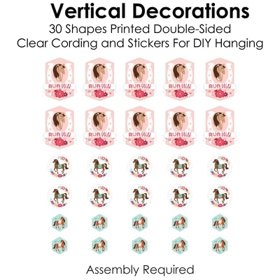 Run Wild Horses Hanging Vertical Decorations INCLUDE 30 shaped pieces, 1 roll clear cording, and assembly stickers. Pretty Pink Floral Pony Vertical Decorations are fun and versatile party danglers for your next Birthday Party. ROOMERIFIC: Run Wild Horses Hanging Vertical Decorations can be displayed at any lengths you choose and make an attractive backdrop for your next Birthday Party. Shaped pieces come in 3 sizes of 10 each, with the following specifications: 10 at 8.5 x 11 inches, 10 at 6.25 x 6.25 inches, and 10 at 4 x 4.5 inches. Hang near a wall to capture fun group photos, or place throughout the room to create a unified theme. These also look amazing when coordinated above gift and buffet tables. DIY DONE RIGHT: Get ready for guests in a snap with this colorful, easy-to-assemble, 30-piece Run Wild Horses Hanging Party Decorations kit. Printed double-sided, each shaped piece includes top and bottom tabs for easy hanging. Simply interlock clear cording into each piece and secure with provided clear stickers. HIGH-QUALITY DECOR: Pretty Pink Floral Pony Hanging Vertical Decorations are professionally printed on heavy-duty cardstock paper. Each piece is individually inspected and carefully packaged by hand. Requires some simple do-it-yourself assembly. Use provided clear cording to display decorations however you prefer. MADE IN THE USA: Run Wild Horses Hanging Vertical Decorations are designed and manufactured at our Wisconsin facility using materials that are Made in the USA.