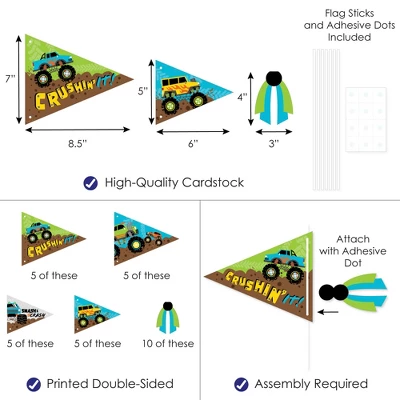 Big Dot of Happiness Smash and Crash Pennant Flag Centerpieces include a set of 20 paper triangle flags, 10 paper tassel shapes, paper sticks, and adhesive dots. Pennant centerpieces will help create an impressive look at your Boy Birthday Party. Party Decor: Make a statement with the Monster Truck table decorations at your celebration. Insert them into vases or Monster Truck arrangements and place them at the center of your tablescape. They are the perfect way to accent your tables and are also a great addition to any photo booth. Easy DIY: Smash and Crash flag decorations come with sticks and adhesive dots for easy assembly. Simply insert a stick into the holes on the side of a pennant triangle and attach a paper tassel with an included adhesive dot. Then, begin arranging your centerpiece decorations! High-Quality Supply: Smash and Crash flags are professionally printed double-sided on heavy-duty cardstock paper with a photo-like shine. Large pennants measure 8.5 inches wide by 7 inches tall, small pennants measure 6 inches wide by 5 inches tall, and paper tassels measure 3 inches wide by 4 inches tall. Assembled In The USA: Smash and Crash Pennant Flag Centerpieces are designed and manufactured at our Wisconsin facility using materials that are Made in the USA – Sticks Made in China.
