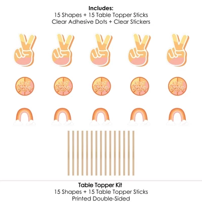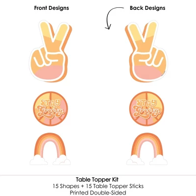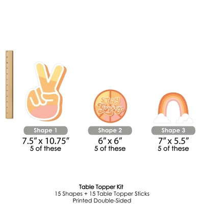 Stay Groovy Centerpiece Sticks INCLUDES 15 Pastel table toppers in three different shapes, 15 table topper sticks, and stickers for easy assembly. Retro party table decorations are perfect for a Boho Hippie Party. Stay Groovy Party Centerpiece Sticks SIZE 5 – Peace Sign (7.5″ x 10.75″), 5 – Peace Symbol (6″ x 6″), and 5 – Rainbow (7″ x 5.5″). The unique design and variety of pieces makes this table decoration kit an impressive addition to any Retro theme party. EASY PARTY DECOR: Stay Groovy table decorations can be used as centerpieces when attached to the included dowels and inserted into vases or floral arrangements. They easily accent your Boho Hippie Party candy buffet when you add them to apothecary jars. Table toppers are also a great addition to any photo booth. The large, shaped cut outs will make your party pics instantly shareable. Pastel party centerpiece sticks are sure to make a statement however you choose to use them! PREMIUM PARTY SUPPLIES: Stay Groovy party table toppers are professionally printed on heavy-duty cardstock paper with a photo-like shine. They are individually inspected and carefully packaged by hand with table topper sticks and stickers for easy assembly. Get creative with your DIY party ideas! MADE IN THE USA: Stay Groovy Party Centerpiece Sticks are designed and manufactured at our Wisconsin facility using materials that are Made in America.