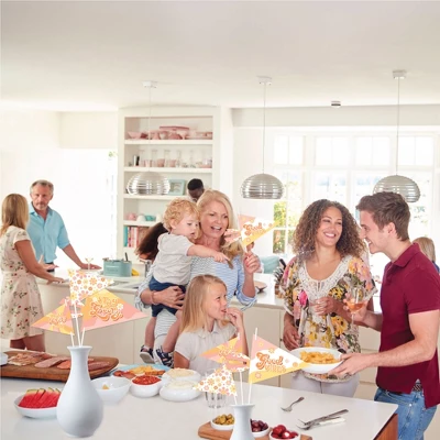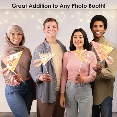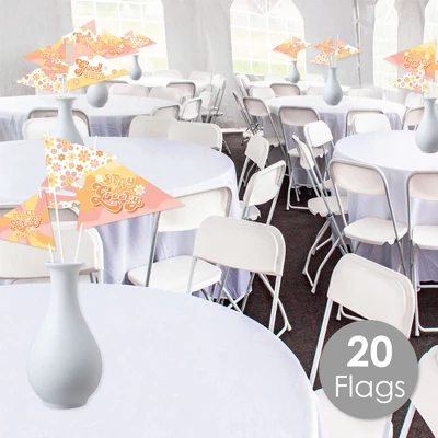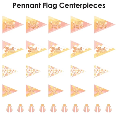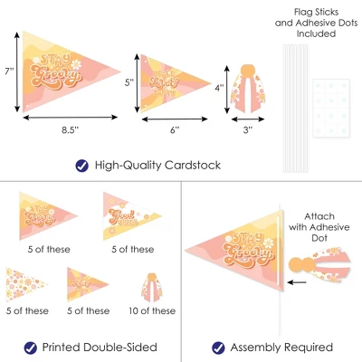 Big Dot of Happiness Stay Groovy Pennant Flag Centerpieces include a set of 20 paper triangle flags, 10 paper tassel shapes, paper sticks, and adhesive dots. Pennant centerpieces will help create an impressive look at your Boho Hippie Party. Party Decor: Make a statement with the Pastel table decorations at your celebration. Insert them into vases or floral arrangements and place them at the center of your tablescape. They are the perfect way to accent your tables and are also a great addition to any photo booth. Easy DIY: Stay Groovy flag decorations come with sticks and adhesive dots for easy assembly. Simply insert a stick into the holes on the side of a pennant triangle and attach a paper tassel with an included adhesive dot. Then, begin arranging your centerpiece decorations! High-Quality Supply: Stay Groovy flags are professionally printed double-sided on heavy-duty cardstock paper with a photo-like shine. Large pennants measure 8.5 inches wide by 7 inches tall, small pennants measure 6 inches wide by 5 inches tall, and paper tassels measure 3 inches wide by 4 inches tall. Assembled In The USA: Stay Groovy Pennant Flag Centerpieces are designed and manufactured at our Wisconsin facility using materials that are Made in the USA – Sticks Made in China.