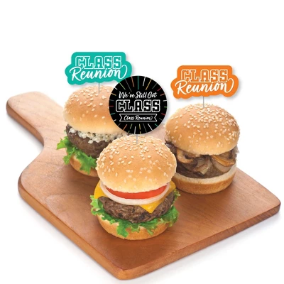 Brightly Colored Dessert Cupcake Toppers INCLUDES 24 clear treat picks, 24 shaped paper cut outs and stickers for easy assembly. DIY Still Got Class cupcake supplies are perfect for a High School Reunion Party. Plastic clear treat pick SIZE 3.5 inches tall with the completed height of the Still Got Class Dessert Cupcake Topper depending on where the plastic pick is attached to the shaped paper cut out. Cupcake toppers are perfect for standard cupcakes and can also be added to appetizers and individual servings of other sweet treats such as brownies or donuts, and even used to create small fruit kabobs. EASY PARTY DECORATIONS: Still Got Class High School Reunion Party picks make it easy to style Brightly Colored theme party. Create impressive cupcake towers with decorated treats placed on a tiered stand at the candy buffet table, style adorable tables with individual cupcakes at each place setting, or make creative centerpieces using decorated treats and a coordinating treat stand. PREMIUM PARTY SUPPLIES: Clear treat picks are made of food-grade plastic and packaged in a food-safe environment. The Still Got Class paper cut out toppers are professionally printed on heavy-duty cardstock paper with themed art on one side and a coordinating pattern on the back. Cut outs will quickly attach to the clear dessert pick and then easily insert into your party appetizers or desserts. EASY ASSEMBLY INSTRUCTIONS INCLUDED: Clear treat picks and Still Got Class shaped cutouts will ship with easy assembly instructions to create unique dessert cupcake toppers.