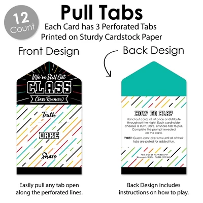 Still Got Class Pull Tabs INCLUDES 12 pull tab game cards that are suitable for a High School Reunion Party. Each card comes with 3 tabs to choose from and instructions on the back. BREAK THE ICE: Entertaining for all! The Still Got Class pickle cards are excellent to ease the mood and use as an icebreaker. Trade cards with others and open a new tab for more entertainment! HOW TO PLAY: Hand out one pull tabs game card to each player. Players will select one tab and easily pull it open along the perforated lines. Share the Truth/Dare/Shares out loud for some good fun. HIGH-QUALITY: Still Got Class Pull Tabs are professionally printed double-sided on sturdy cardstock paper with a photo-like shine. They are individually inspected and carefully packaged by hand. MADE IN THE USA: Still Got Class Pull Tabs Game is designed and manufactured at our Wisconsin facility using materials that are Made in the USA.