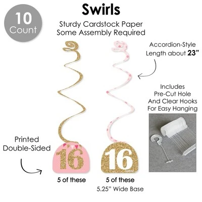 SWIRLS includes: 10 total swirls with 2 designs – 5 count per design, that hang with an accordion-style spiral. Professionally printed double-sided, the Sweet 16 decoration swirls come with a 5.25” wide base and a spiral length of about 23” long. Each decoration swirl comes with a pre-cut hole and clear hooks for easy assembly. BUNTING BANNER includes: letter and themed pennants, perfect for your 16th Birthday Party. Each pennant measures 5” wide x 7.25” tall. Pennants are numbered in sequence and ribbon is included for easy assembly. TABLE TOPPERS includes: 10 centerpiece sticks that come with two shape cut-out designs, each professionally printed double-sided. The centerpiece shapes measure 7.5” wide x 5” tall. To use as centerpieces or photo props for your Birthday Party, assembly stickers are included for the easy DIY required assembly. CIRCLE CONFETTI includes: 30 paper circles with 2 different sizes -10 large circles, size 3.5” and 20 small circles, size 2.75”. Professionally printed double-sided, the Sweet 16 circle confetti can be placed flipped over for added variety. Scatter around your table for a delightful accent. MADE IN THE USA: Sweet 16 Decor Galore Party Pack is designed and manufactured at our Wisconsin facility using materials that are Made in the USA. Sweet 16 Decor Galore Party Pack uses a No-Mess Glitter Print: Our Party Pack is designed with a printed image of glitter, eliminating glitter flake while maximizing bling effect!